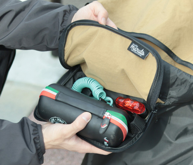・収納袋が一体になったパッカブルタイプで、自転車収納時は便利な小物入れとしても使用可能