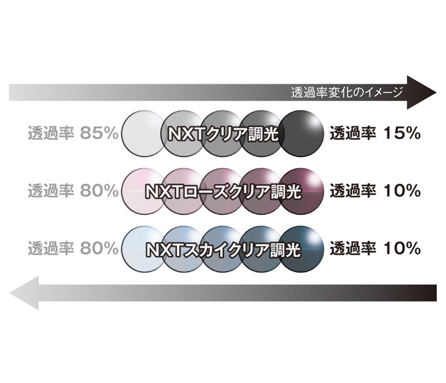 ・NXT調光レンズの中でも最も広い可視光線透過率の変化幅をもつレンズを採用