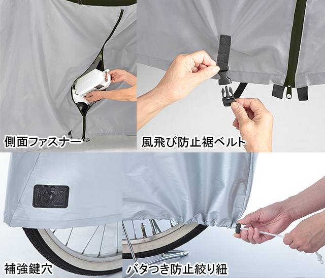・ワイヤー錠などを通せる鍵穴を厚手生地で補強し前輪の裾に搭載、盗難防止に最適
