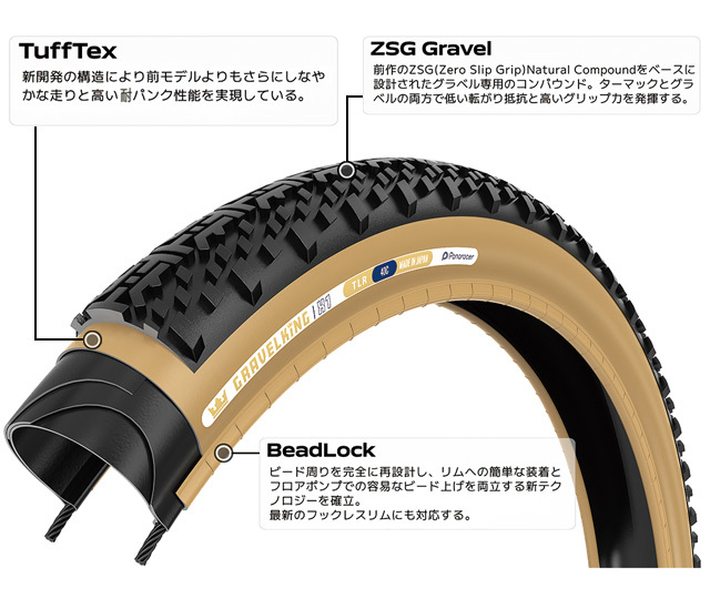 ・GRAVELKING専用に新たに生み出された新構造「TuffTex」は、しなやかで高密度を誇るケーシングに走行性能を阻害しない素材によりビードからビードまで保護して強化されしなやかな走りを実現