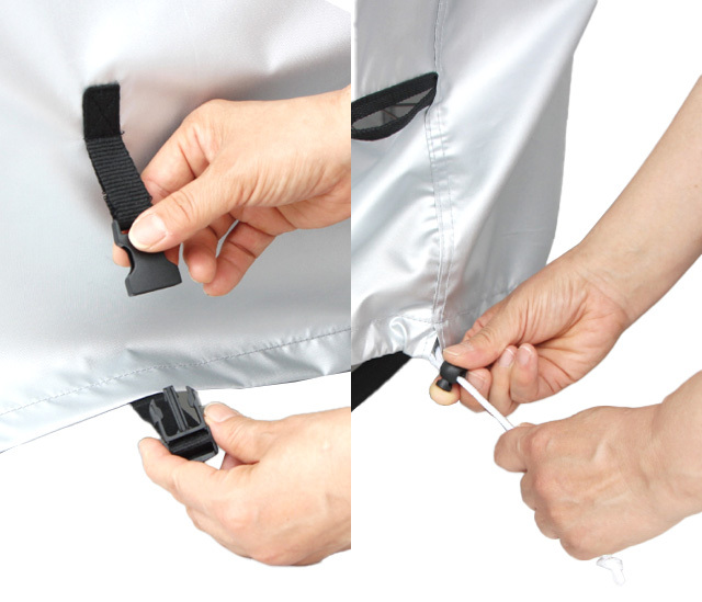 ・後方には裾絞り用紐付きで車体にピッタリとフィット