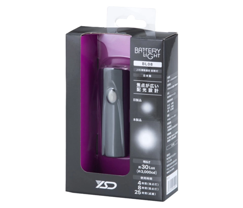 ・コンパクトなデザイン・JIS規格に適合・使用時間:4時間(強点灯)、8時間(弱点灯)、25時間(点滅)