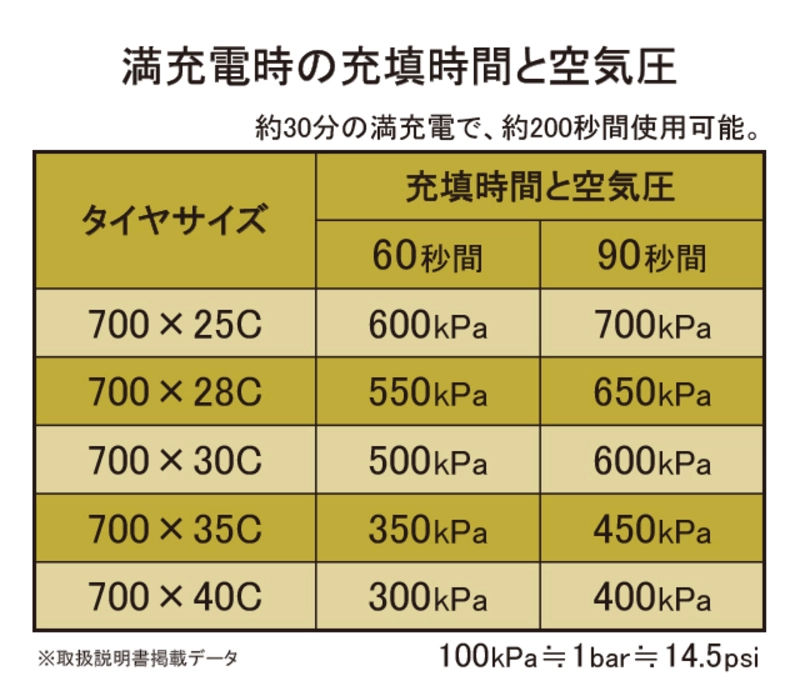 ・タイヤサイズ700x25Cの場合、前後700kPaまで充填可能