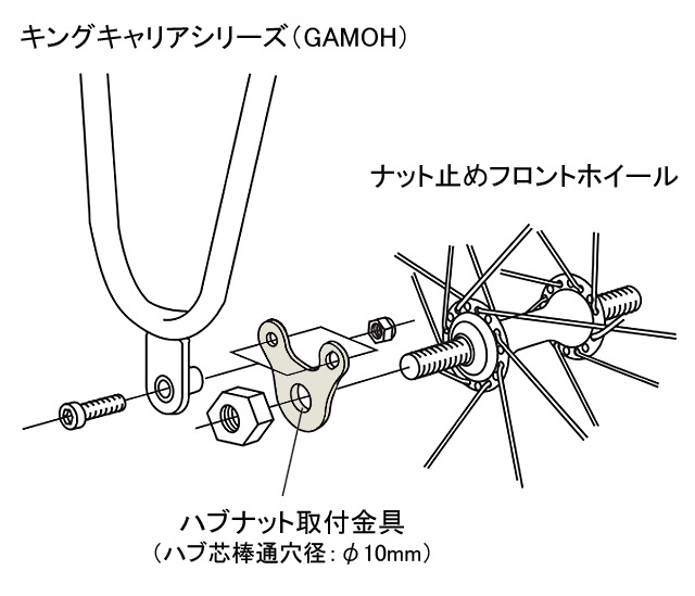 ・キングキャリアシリーズ(GAMOH)をナット止めフロントホイールに取り付けるアダプター(※クイックレリーズ用は別のアダプターとなります。)