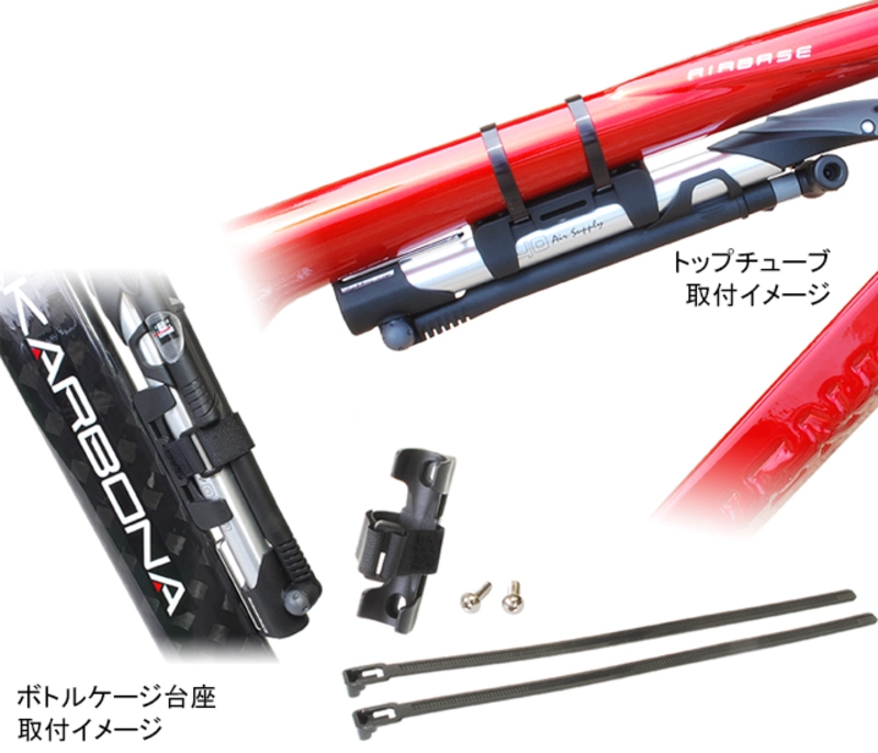 ・専用ブラケットはダウンチューブ、シートチューブなどのボトルケージ台座に取り付けるネジと、固定場所が自由で取り外しが可能なバンドの2種類で固定することが可能