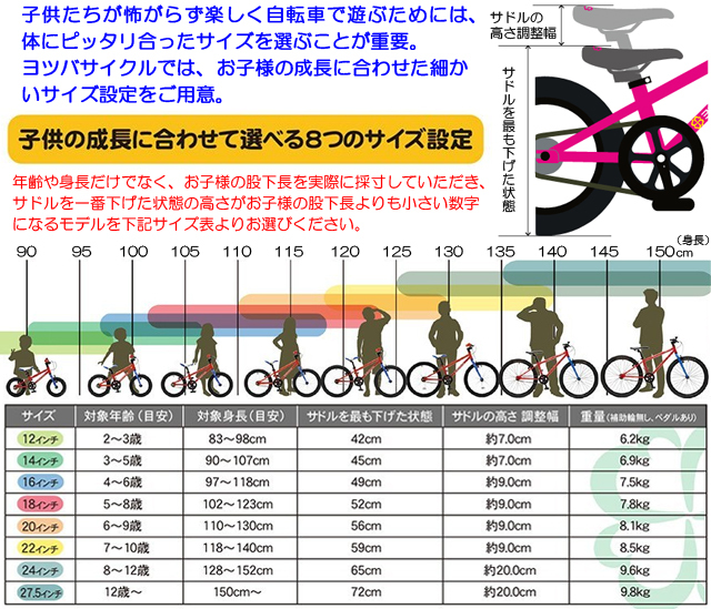 ・お子様の成長に合わせてピッタリ選べる8つのサイズ設定(2インチ刻み)で、充実のサイクルライフをサポート