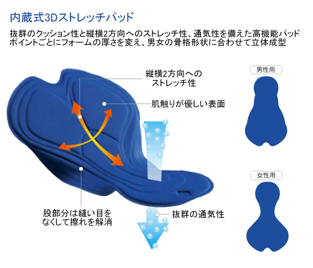 ・抜群のクッション性と縦横2方向へのストレッチ性、通気性を備えた3Dストレッチパッドを内蔵